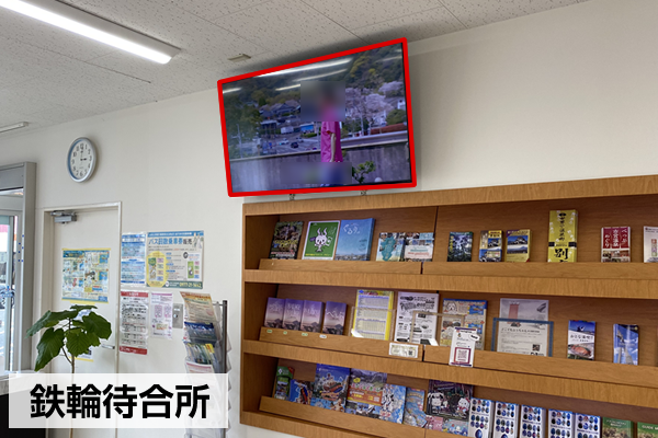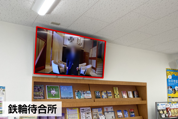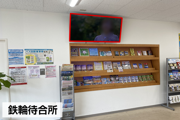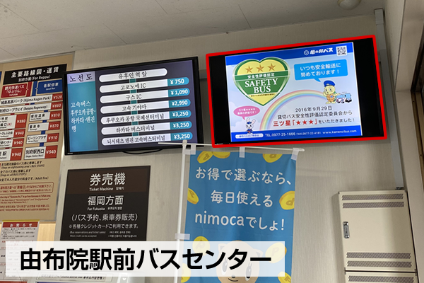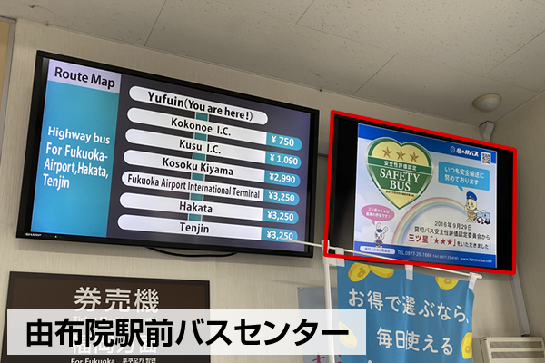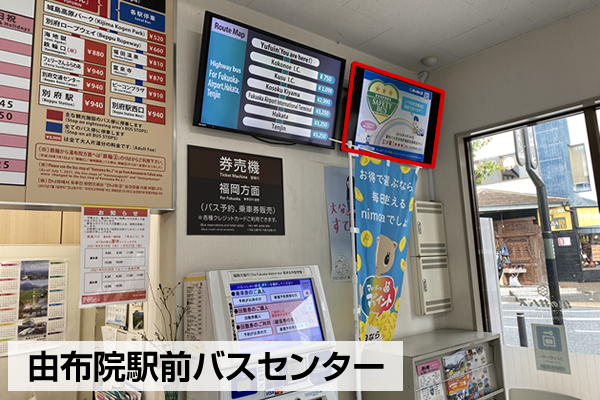 亀の井バス由布院駅前BC、鉄輪待合所に設置してあるデジタルサイネージを利用した広告掲出。地域住民に加え、訪れる多くの観光客に向けたPRが可能です。